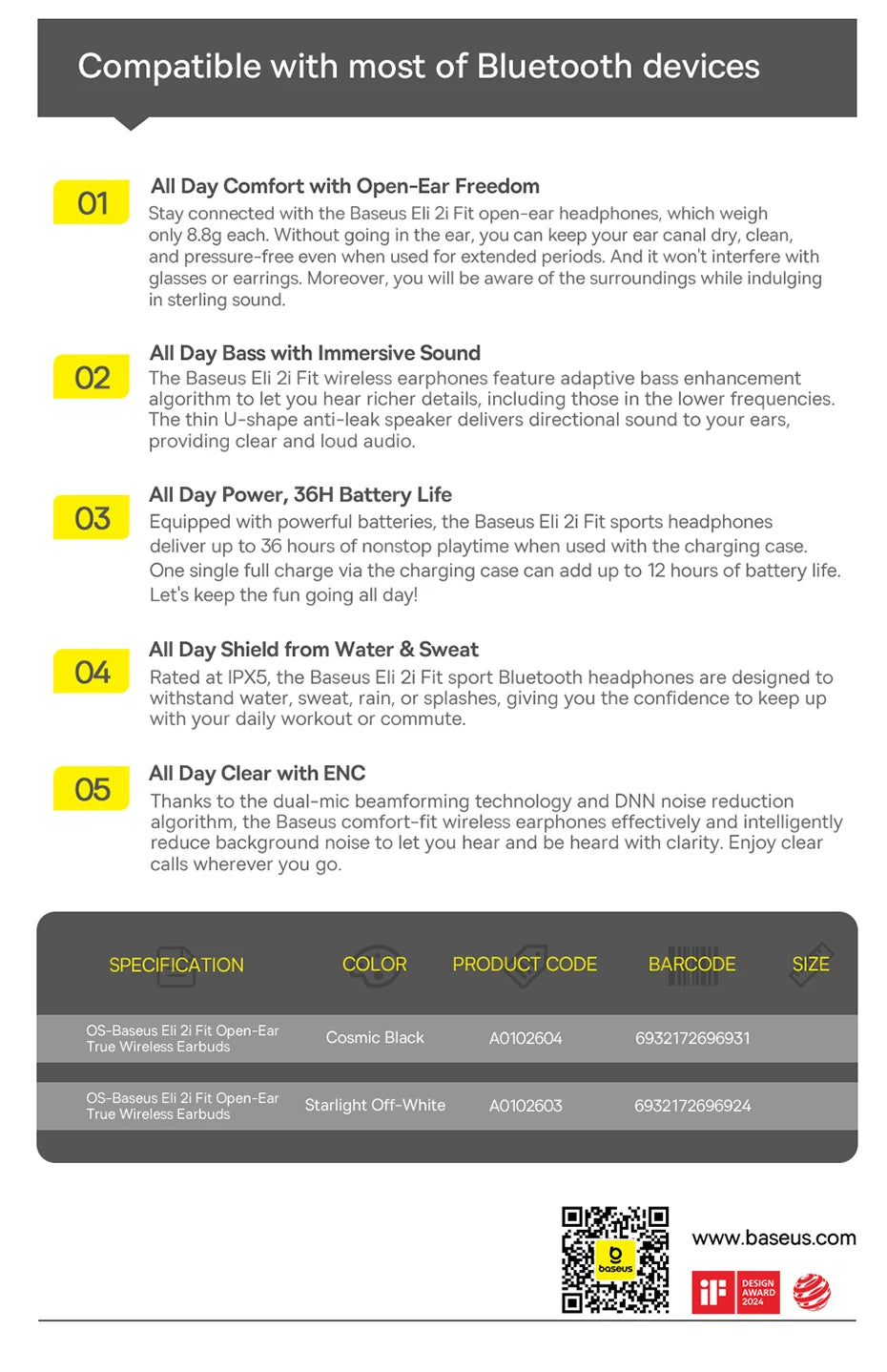 Experience premium open-ear audio with the Baseus Eli 2i Fit earphones. Featuring Bluetooth 6.0 connectivity for stable, lag-free pairing, these wireless earbuds deliver enhanced bass through advanced audio tuning. The secure ear hook design keeps them firmly in place during intense workouts, while IPX5 waterproof rating protects against sweat and splashes. Ideal for athletes and active listeners who demand comfort without compromising sound quality or situational awareness.
