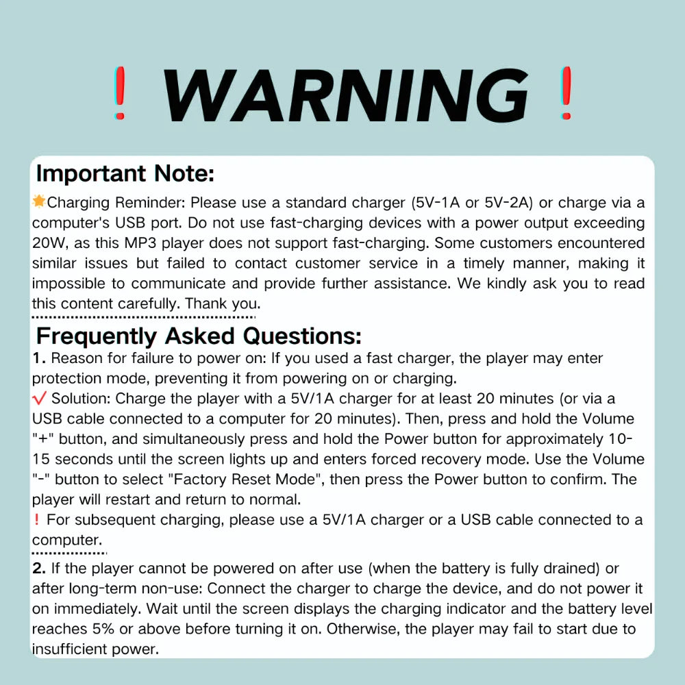 Charging Tips: Use 5V-1A or 5V-2A ordinary charging head or computer USB charging. Please do not use more than 30W fast charger, MP3 player does not have fast charging function