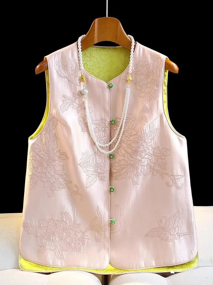 Satin Silk Embroidered Vest Women Chinese Style Vintage Vest Sleeveless Retro Tops Female Autumn New Fashion