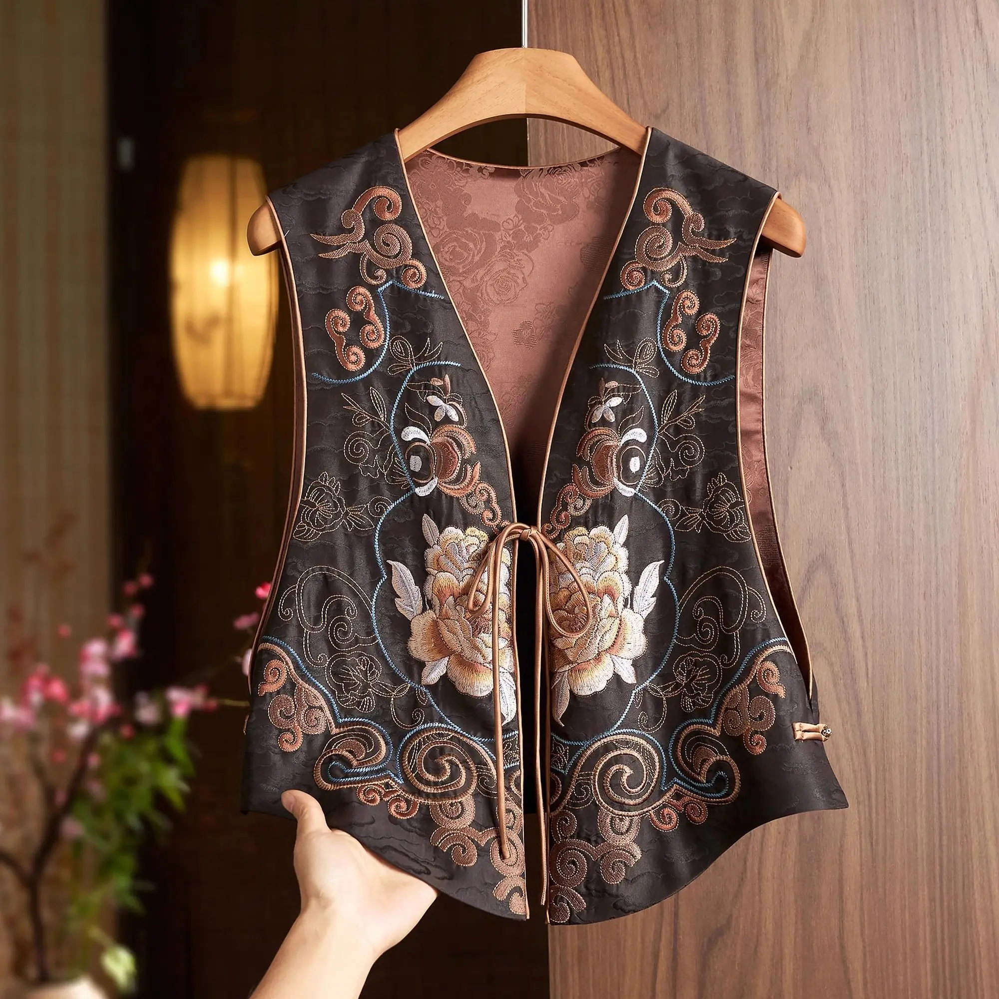 Satin Silk Vest Jacket for Women Spring 2025 New V-Neck Chinese Style Embroidery Top Women's Fashion Outerwear