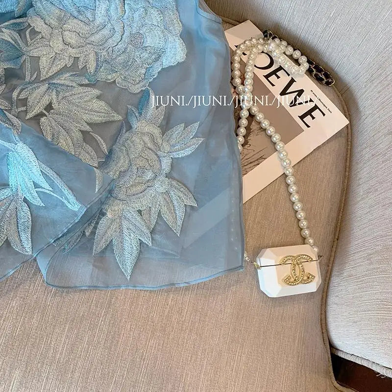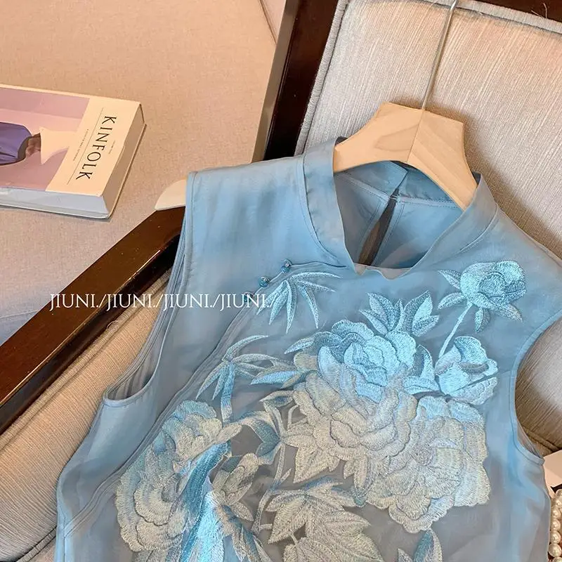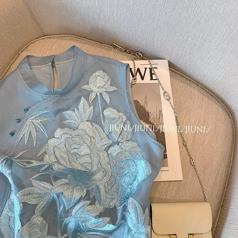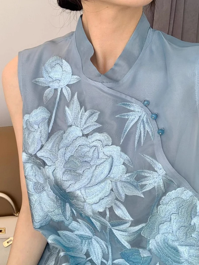 Summer Sleeveless Shirt Embroidered Slanted Stand Collar Chiffon Top Elegance Vest Blouse Chinese Style Women's Clothing